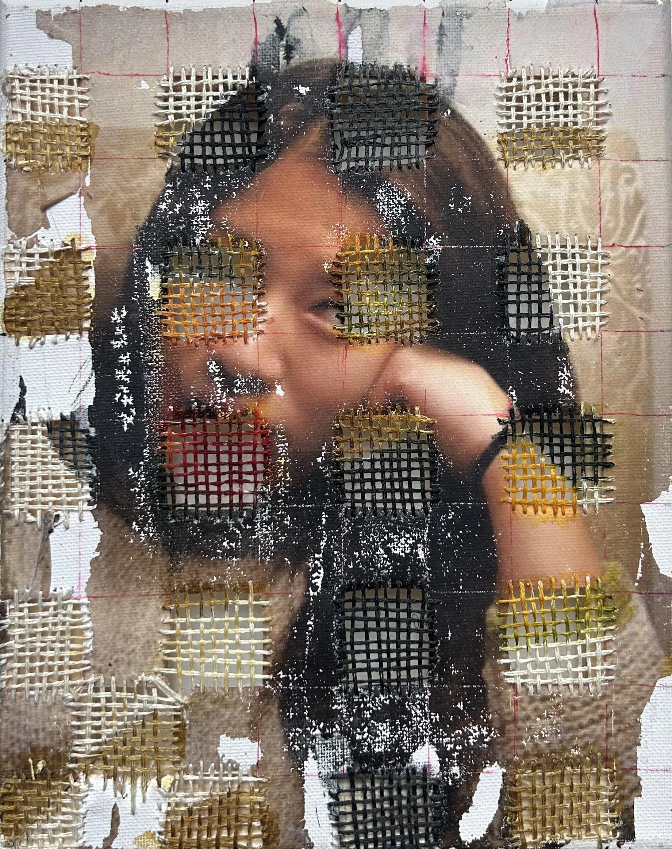 Pixels of Katharine, 2026, inkjet print, oil, silk, and silk dye on canvas, 11x8”